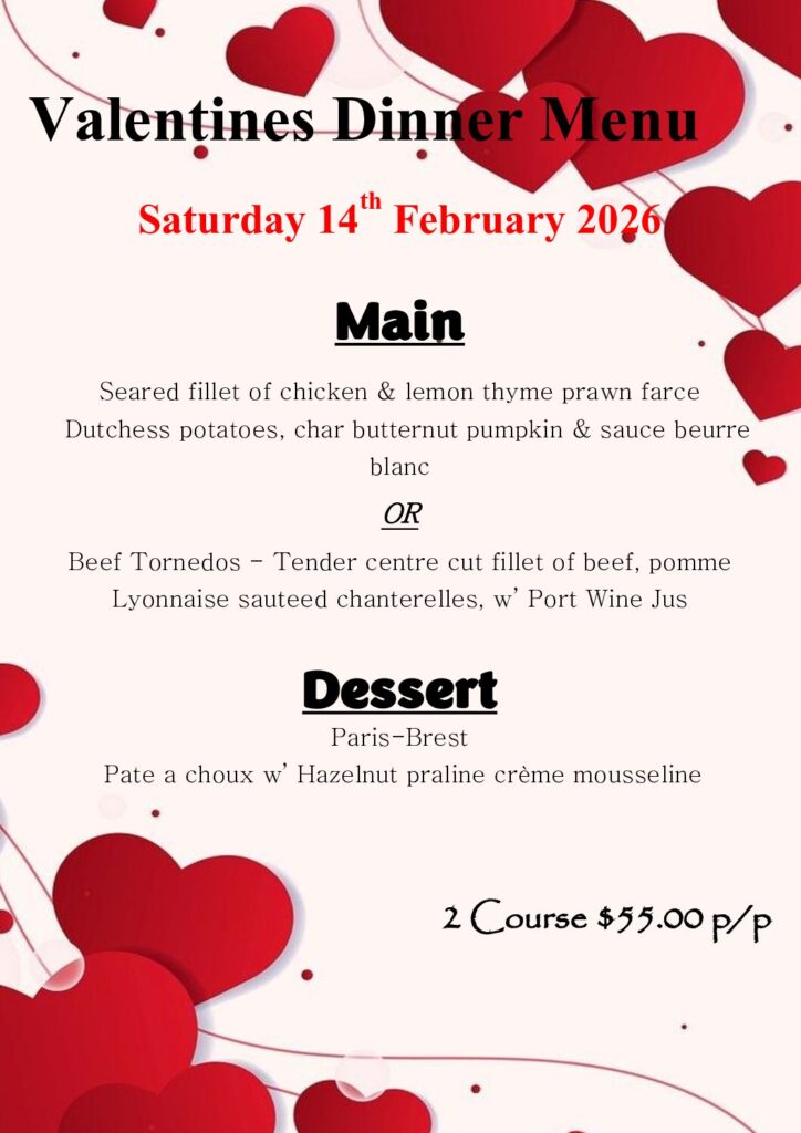 Valentine's Day Menu Saturday 14 February 2026 Enjoy a special meal with your special someone. Bookings highly recommended. Make a reservation